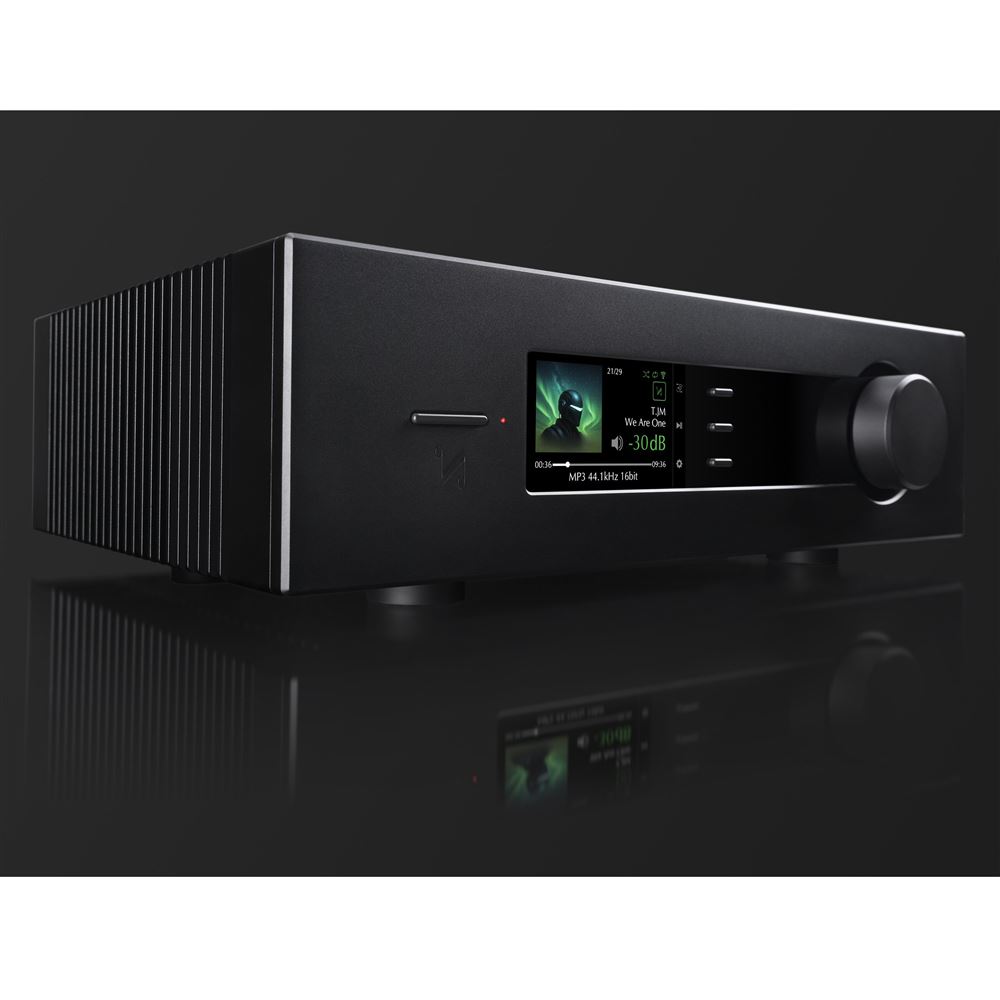 The 4.3-inch, 800 × 480 pixel IPS screen offers full menu navigation, multi-language support and real-time playback information. Choose between artwork-centred, data-rich or VU-meter displays—or dim the screen entirely for late-night sessions. A sculpted system handset mirrors the PLATINA design language and unifies command of every component in the range, while the front-panel encoder and included remote control provide precise, menu-driven control for swift parameter adjustment.